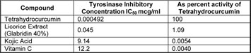Tetrahydrocurcuminoids inhibit cross linking of proteins, supporting healthy aging. Described as a "crossregulin" composition, this natural ingredient is effective in skin lightening, and offers protection against UVB rays, melanoma, and age spots. Tetrahydrocurcuminoids also support skin texture through inhibitory effects on enzymes that help to break down connective tissues. The composition also effects skin lightening effects through tyrosinase inhibition. A branded Tetrahydrocurcumin product (patents pending) was found to be several fold more effective as a skin lightener than other natural skin lightening agents including glabridin (licorice extract) and kojic acid. The comparative tyrosinase inhibitory activity of these natural materials is summarized in Table 1 (7):