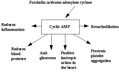 Adenylate cyclase is the enzyme involved in the production of Cyclic Adenosine Monophosphate (cAMP), a significant biochemical agent in metabolic processes. Cyclic AMP is a "second messenger" hormone signaling system. cAMP and therefore forskolin have marked physiological effects through such "second messenger" actions on various biological processes in the body, as schematically represented in Figure1.