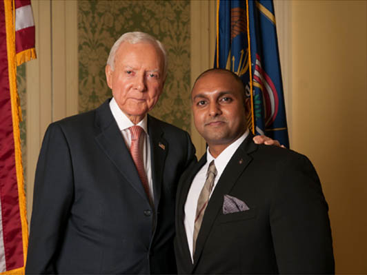 Representative of Sabinsa Corporation USA joined Sen. Orrin G. Hatch, R-Utah, at a luncheon celebrating the 20th anniversary of the Dietary Supplement Health and Education Act (DSHEA) on Oct 23 in Salt Lake City, hosted by the United Natural Products Alliance. The event also honored the senator's role in the passage of the act and his continuing support of the dietary supplement industry. Shown here are (from left to right): Sen. Hatch and Shaheen Majeed, Marketing Director, Sabinsa Corp. USA.