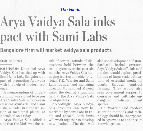 Sabinsa’s sister company Sami Labs entered into a Memorandum of Understanding with India’s premier Ayurvedic practice and research organization, Arya Vaidya Sala, Kottakkal (AVS), to further the use of modern scientific methods and technology in exploring more deeply the knowledge base of Ayurveda, with the ultimate goal of improving the health of mankind.