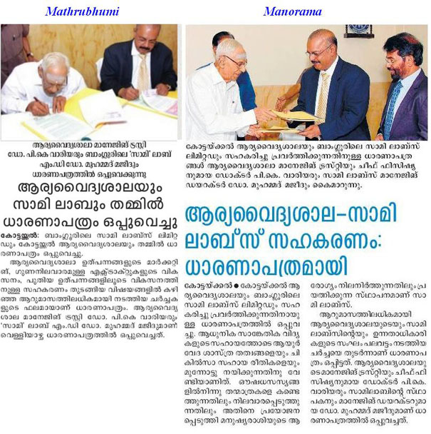 Signing Ceremony: Padmabhooshan Dr. P K Varrier, Managing Trustee, AVS, Kottakkal and Dr. Muhammed Majeed, Founder and Managing Director, Sabinsa & Sami Labs