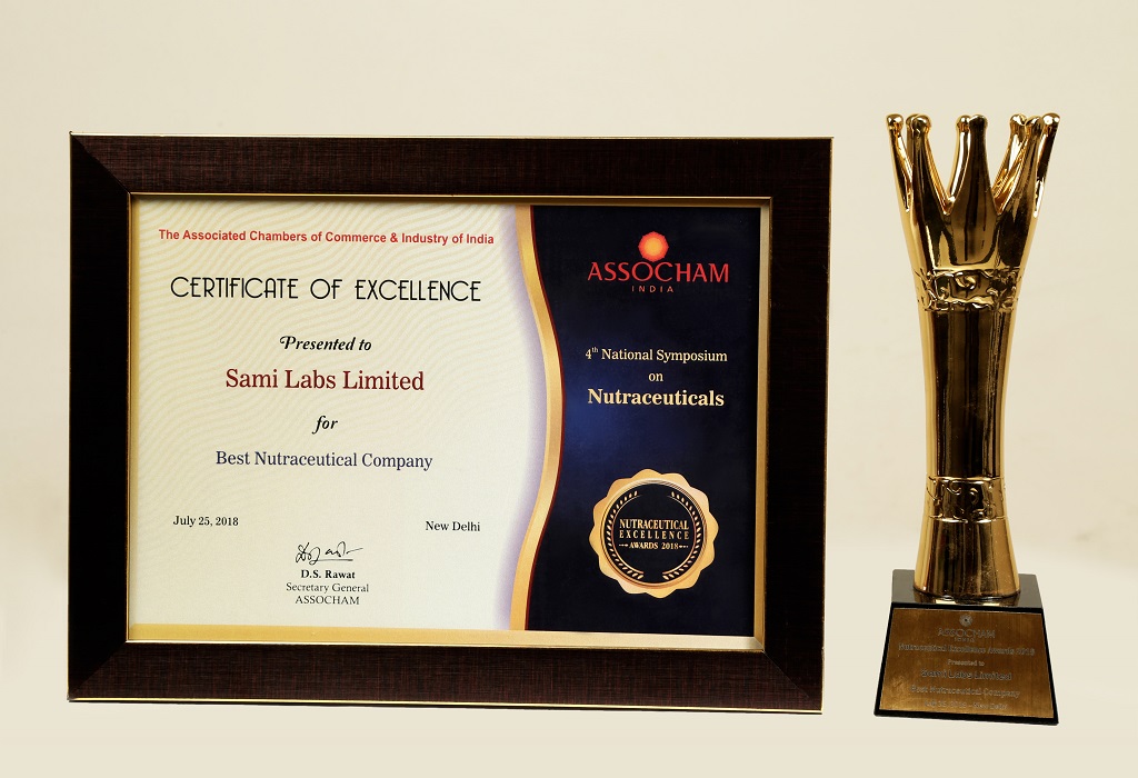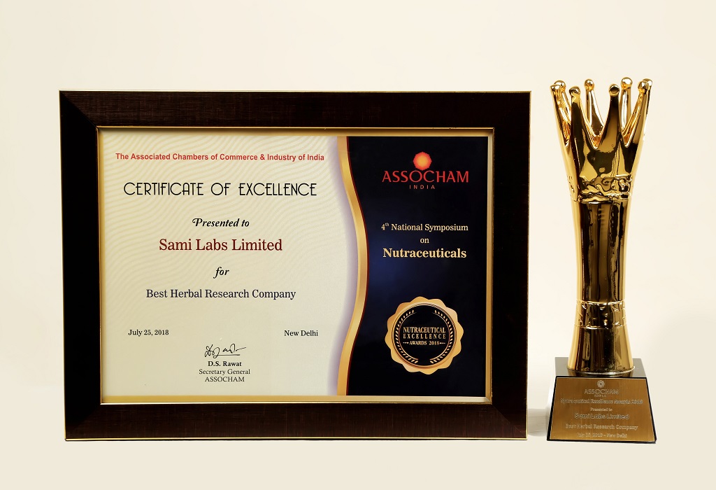 Pan VG Nair, Dyrektor Generalny; Sami Labs Ltd uhonorowana nagrodą dla najlepszej firmy prowadzącej badania nad ziołami, przyznanej przez pana Ashwini Kumar Choubeya, Honorowego Indyjskiego Ministra Zdrowia i Opieki Rodzinnej, na Krajowym Sympozjum Assocham na temat Nutraceutyków, żywności funkcjonalnej i suplementów diety w Delhi w dniu 25 lipca 2018 roku.