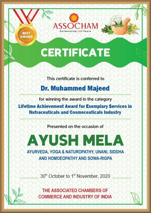 ASSOCHAM acknowledged Sami-Sabinsa Group’s Founder & Chairman, Dr. Muhammed Majeed, for his immense contribution towards shaping the Indian Cosmeceutical industry by presenting him with the ‘Legend of Natural Cosmeceuticals’ award. In addition, the Group received accolades for ‘Best Personal Care Product of the Year 2020’ for its premium beauty product - Johara® Turmeric Bath Soap and ‘Best Cosmetic Ingredient Manufacturer of the Year’ for Sami Labs Limited.